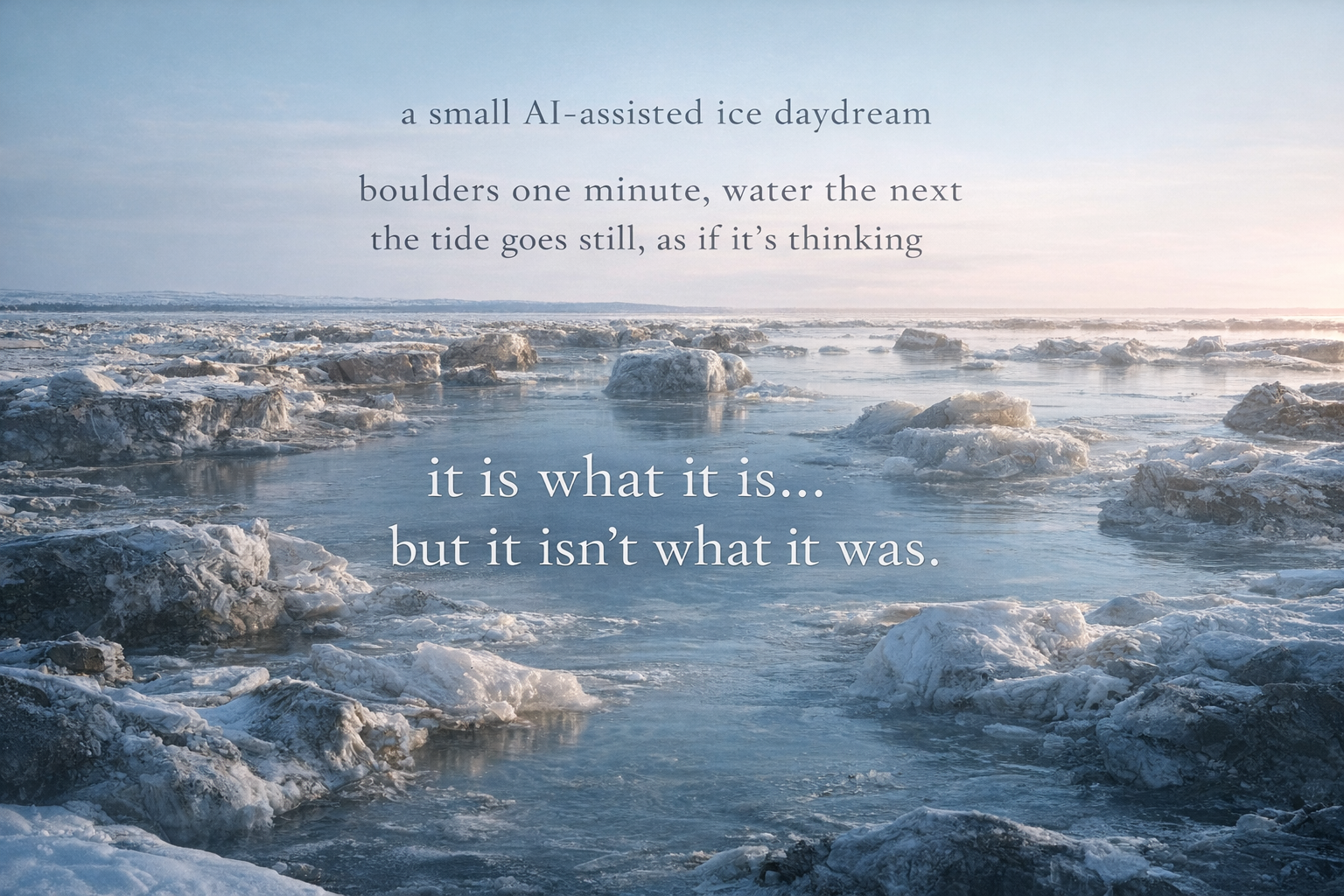 The tide goes still, as if it’s thinking, A frozen field begins to come apart